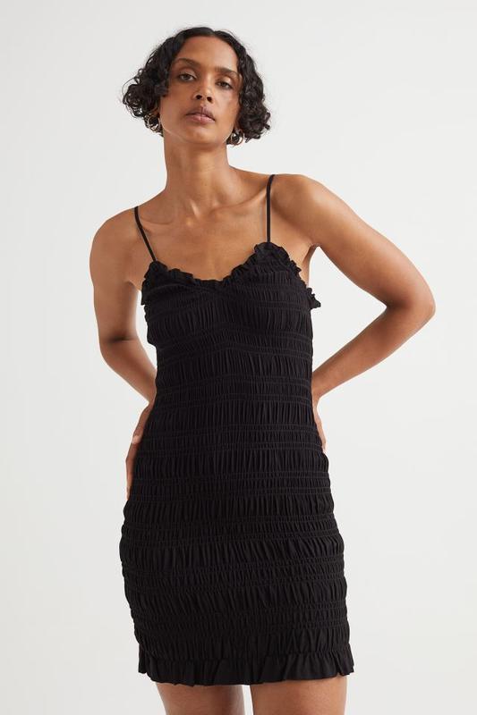 Короткое приталенное платье из вискозы с V-образным вырезом и узкими регулируемыми бретелями. Небольшая оборка вокруг декольте и подола. Без подкладки. Длина 71, в груди 31, тянется.