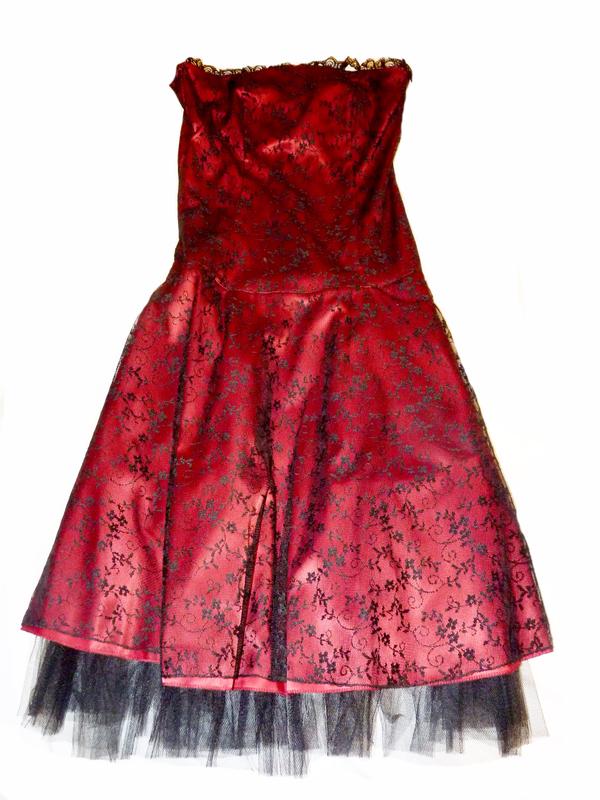Вечернее платье из тёмно красного плотного атласа с чёрным кружевным гипюром. Пышная юбка с подъюбником из фатина который длинее самого платья на 10см. Очень красивое и элегантное платье. Длина самого платья – 88см. Длина платья вместе с выглядывающим фатином – 98 см. Ширина пояса – 44см. Ширина на груди – 37см. Длина от верха до основания юбки – 41см. Длина от основы юбки до низа – 47 см.