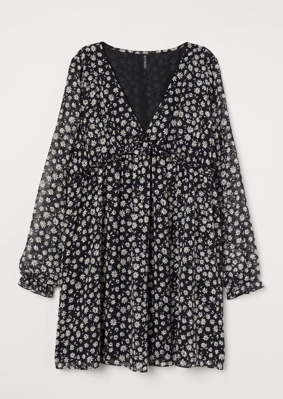 Размер L Короткое платье из шифона с v-образным вырезом горловины, швом с небольшой оборкой под грудью, а также длинным рукавом с узкой резинкой и небольшой оборкой на манжете.
