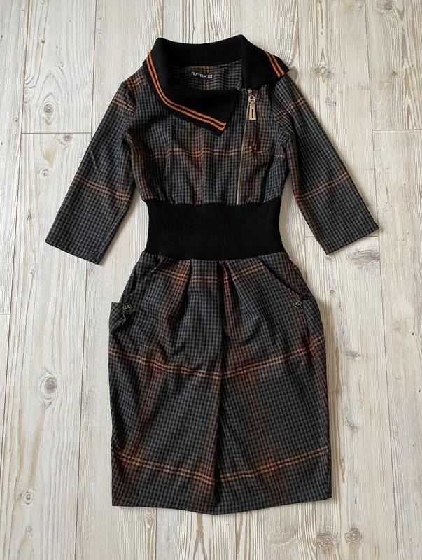 Трикотажное платье в клетку с рукавами 3/4. Пояс красиво тянется. Есть замок спереди и сбоку, два кармана. В идеальном состоянии.Подойдет на L. Замеры на последнем фото.