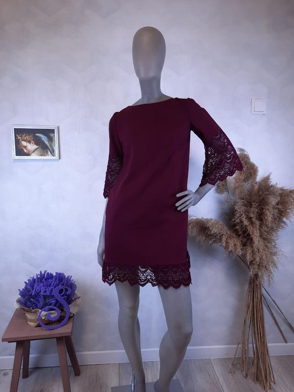 Женское бордовое платье ODIS. Прямого покроя с широким красивым кружевом внизу платья и на рукавах. Рукав три четверти. Сзади застежка длинная молния. Два боковых кармана в швах. Состояние б/у, в отличном состоянии Производитель ODIS Размер S (44), по бирке 36 Цвет бордовый Состав 73% хлопок, 22% полиэстер, 5% лайкра Замеры: полуобхват груди 44 см, полуобхват талии 45 см, полуобхват бёдер 48 см, длина рукава 44 см, ширина по плечам 36 см, длина 87 см