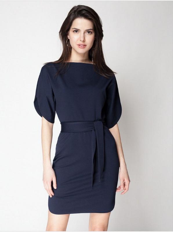 Платье трикотажное в темно-синем цвете без карманов с вырезом горловины лодочка, с рукавом. Пояс можно завязать как угодно или вообще снять, обвязав талию ее можно визуально заузовать поясом. Юбка чуть выше колен (зависит от роста) Длина 92 Груди 51,крой летуча Рукав от горловины 42 Талия 36 Стегна 44 На размер ХС/С
