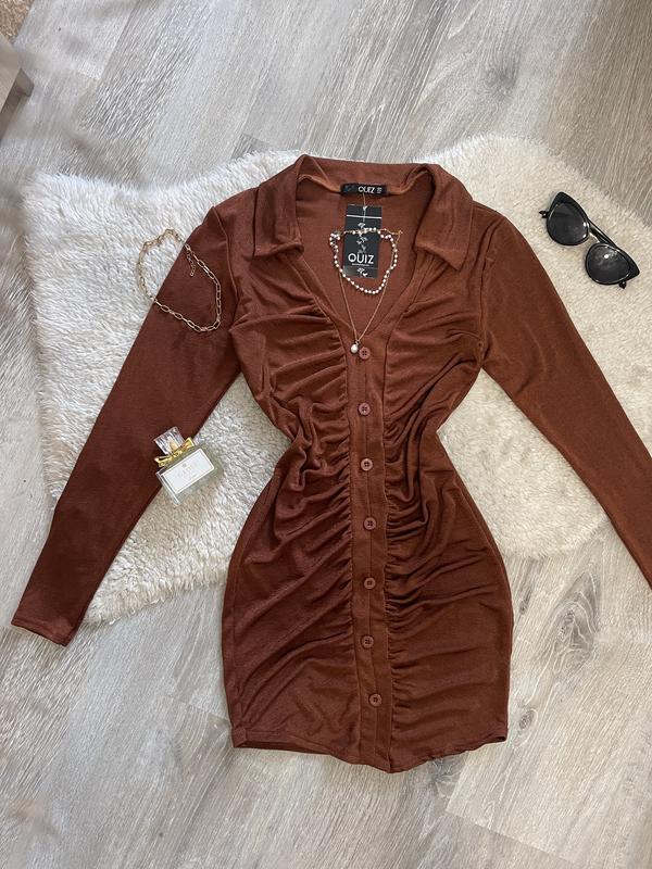 Облегающее платье с драпировкой от Quiz 🤎 Тканина з легким блиском, ґудзики для краси; Хорошо тянется и шикарно облегает; Нова 🖇️ Размер - S/M; Длина - 75 см; Пог - 42 см; Талия - 34 см; Бедра - 41 см; Рукав - 57 см; Плечи - 40 см; Тянется +-ще до 15 см;
