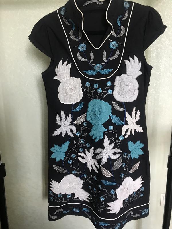 Платье женское, с очень красивой вышивкой из цветов, в очень красивом состоянии, размер: 44-46, выполнено из натуральной ткани: 97% - хлопок (коттон), 3% - эластан.