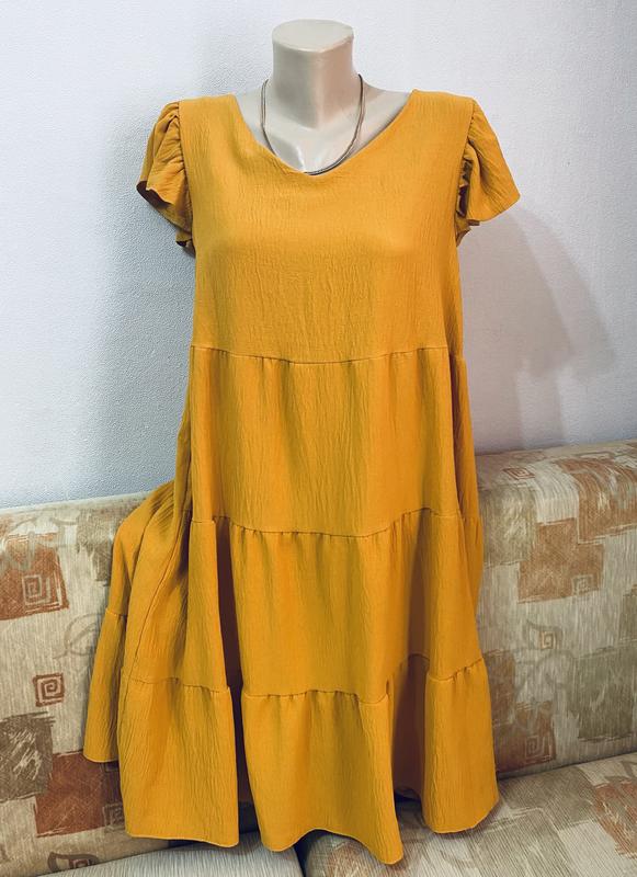 Женское летнее платье легкое и комфортное, желтого цвета, состав отсутствует, ткань напоминает муслин, слегка тянется. Размер указан 46, как на меня то и на 48 будет хорошо, смотрите замеры. Полуобхват груди 49 см., в бедрах свободно, длина 94 см. Смотрите все мое объявления есть много разных вещей!