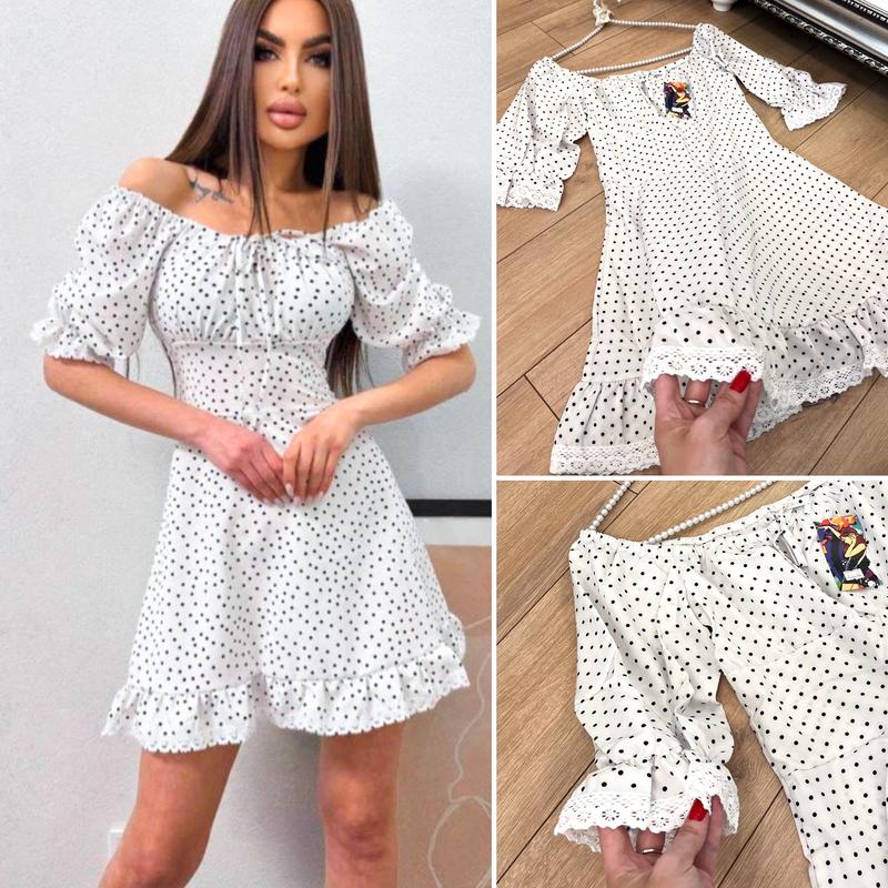 Роскошное платье в горох с рюшами, по 2 шт каждого цвета) Цвета: белый/черный/голубой В размере XS/S и S/M Очень красиво смотрится на теле😍 Длина от плеча 84/85 см