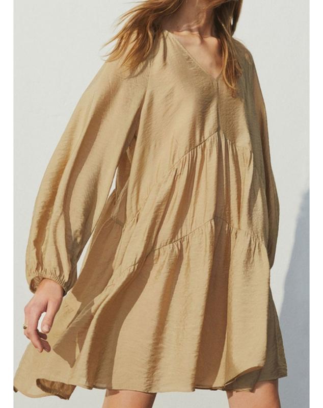 Легкое, Короткое платье А-силуэта из вискозы. С глубоким V-образным вырезом, длинными широкими рукавами, узкими эластичными полосками на манжетах и асимметричными сборными разделительными швами для дополнительного пространства.Размер указан хс, но также подойдет на С- М. Стан новой. Ткань вискоза 82%. Замеры: Полуобхват груди 48 см Длина рукава от горловины 67 Длина платья спереди 68 Длина платья сзади 90(от плечевого шва) Полуобхват талии 53см Бедра свободные, как и талия в принципе. Смотрите также другие Мои объявления и подписи на мой шкаф 🎀