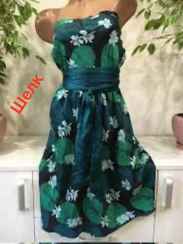 Стильное платье с оголеными плечами известного бренда. Непросвечиваеться,без подкладки. Состояние очень хорошее,сзади внизу на чёрном небольшие дефекты на ткани,но принт насыщений,смотрится органично,незаметно. Размер указан 40 Меряйтесь по замерам. Талия завышена на резинке. Сзади тоже есть резинка на окончании. Длинна от груди 86 Пог42 в натяжке 48 Пот33 Тянется на 53 Поб -свободно Пояс в комплект не входит