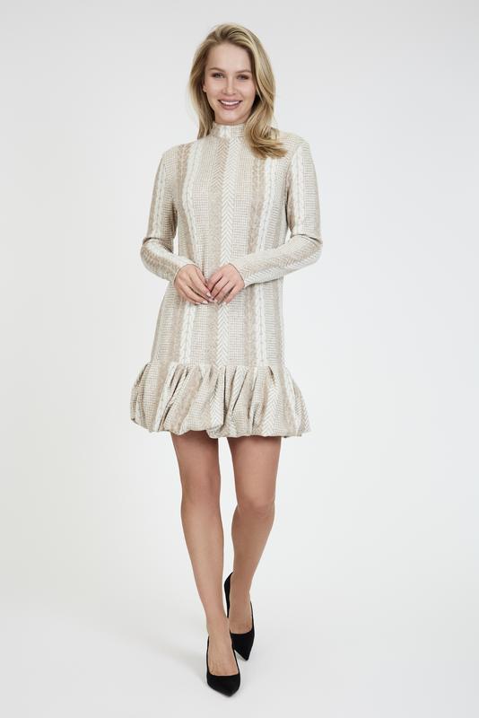 Платье женское бежевое by ANDRE TAN S новое бирки Мини-длина в течение длительного времени остается символом женственности. Бежевое короткое платье подчеркивает достоинства фигуры благодаря мини длине и облегающей форме. Изделие напоминает гольф с длинным рукавом и воротником-стойкой. Особого шарма придает оригинальный принт с косами разных видов. Главное украшение изделия – объемные декоративные воланы по нижнему краю. В состав ткани входит шерсть, вискоза и полиакрил, обеспечивая комфорт и тепло 38% шерсть,37%вискоза,25%полиакрил.