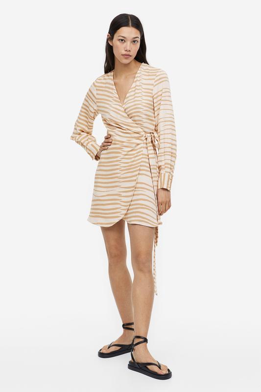 Короткое платье из плетеной ткани. V-образный вырез и обвертка спереди с широкими завязками с одной стороны и потайной пуговицей с другой. Длинные рукава с прикрытыми пуговицами на манжетах. Без подкладки. Размер: L 1165366002
