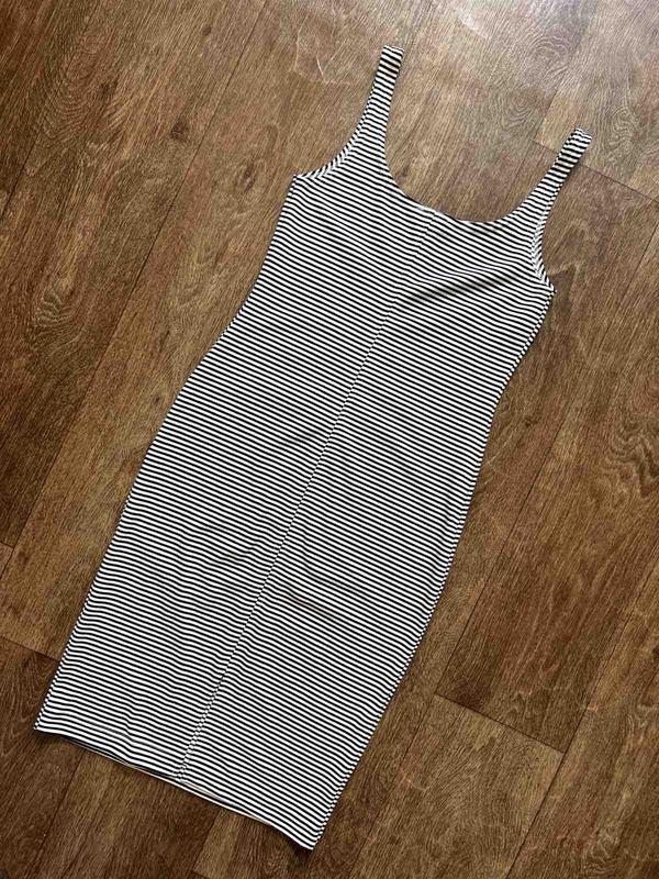 Платье в полоску, тельник, размер M, длина 102 см, полуобхват груди 37 см, полуобхват бедер 44 см, хорошо тянется, сзади небольшой разрез, красиво садится по фигуре