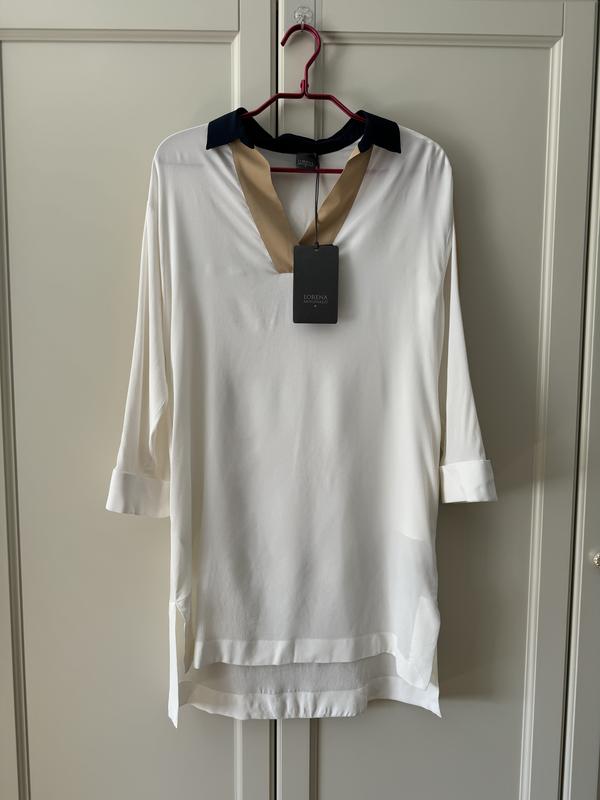 Lorena Antoniazzi Новое платье -рубашка Цвет белый , воротник темно-синий , полоски на рукавах бежевые Размер 40 ит - Плечо спущено 53 Рукав 48 Пог 51 Длина 87/ 96 Состав 31 % шелк , 69 % ацетат Цена бутика 560 евро, продаю за 190 евро по курсу на день оплаты Без торга
