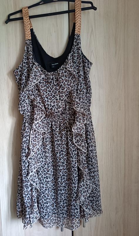 Платье в леопардовый принт на подкладке.Размер М.На поясе резинка.Длина 90см.ПОГ тянется до 53.ПОБ (резинка) тянется до 53.