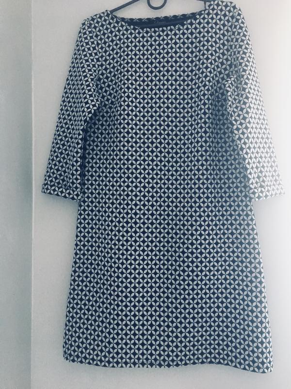 Платье из плотной ткани выше колен прямого кроя. Размер S. Длина по спинке-87см. Рукав 3/4.