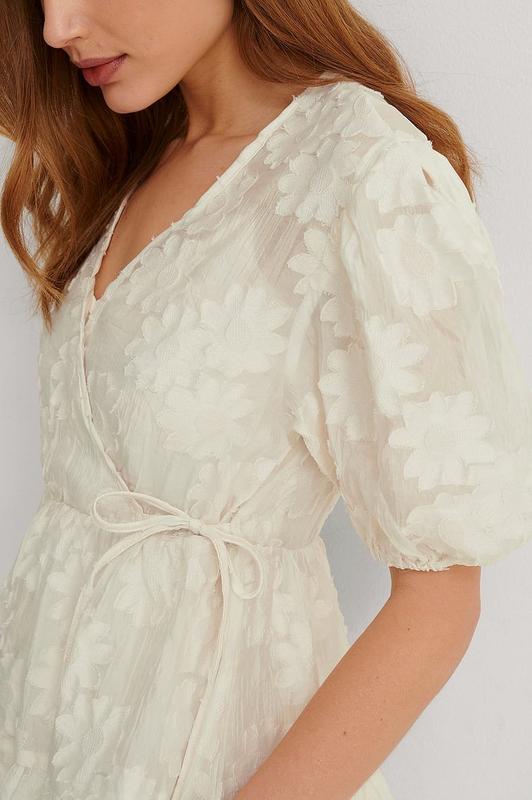 платье с цветами Данное платье имеет нижнюю часть, многослойный V-образный вырез, пышные короткие рукава с эластичными манжетами, собранную эластичную талию с самостоятельной застежкой, слегка прозрачный материал с рюшами. Это платье белого цвета. Состав: Подкладка: 100% Полиэстер Внешне: 100% Полиэстер
