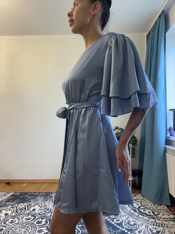 Красивое сатиновое легкое платье, актуальный низ клеш, в талии имеет резинку, красиво подчеркивает талию поясом. Размер s, новая, не носилась.