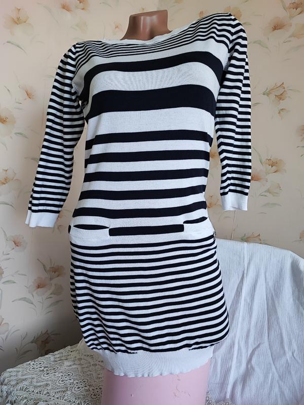 Короткое брендовое платье белого цвета в полоску тёмно-синего цвета ( практически черного). Вырез лодочка. Спереди два маленьких кармана. Прямого силуэта, отлично садится по фигуре. ПОГ-ПОТ-ПОБ 46-42-46 см. Рукав до локтя. В плечах 36 см. Длина рукава от плеча 44 см. Качественный тонкий трикотаж, хорошо тянется. Приятная к телу ткань. Все логотипы соблюдены. Новая вещь, одевалась один раз. Следы ношения отсутствуют. Дефектов нет.