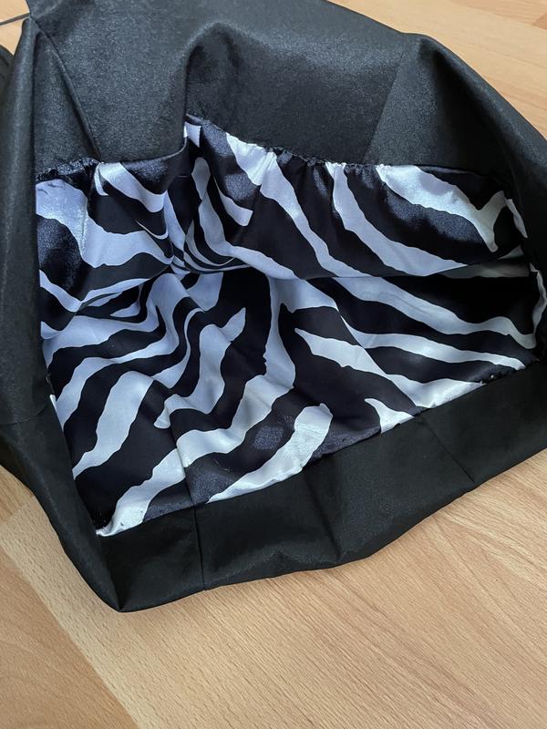 Короткое платье, одевается подмышки и завязывается на шее, имеет спереди бантик в пайетках, есть скрытая молния, имеет яркий подклад в виде зебры