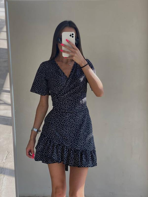 💕РЕАЛ ФОТО💕 В наявності у кількості🔝 🔺Сукня модель 2308 тканина : софт принт колір: чорний, білий розмір: 42-46 (one size) Легка невесома сукня на запах в дрібний горошок💕 Ідеально сідає на будь-яку фігуру. Якість👍🏻 Параметри: ОГ: 85-95 см