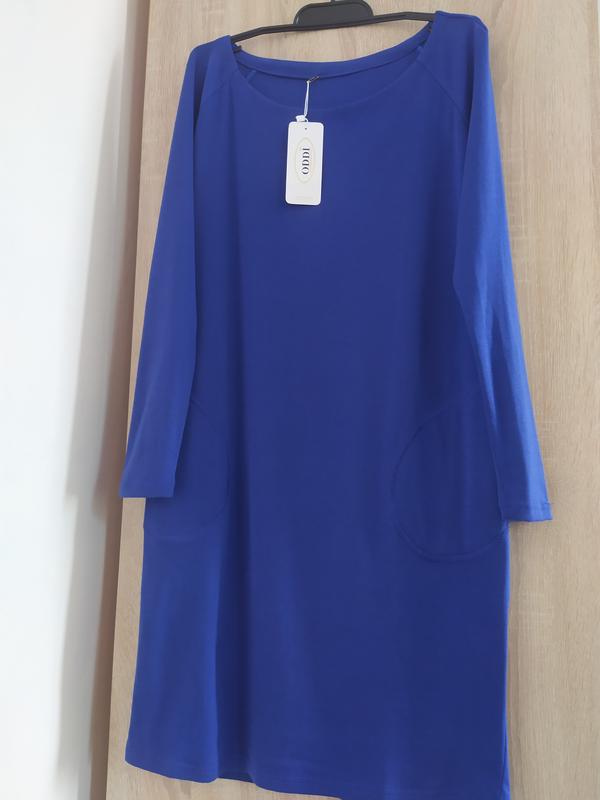 Синее трикотажное платье с карманами