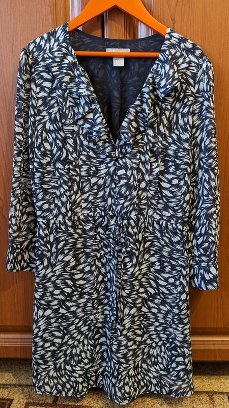 Продам шифоновое платье H&M темно синего цвета с белым узором. Нежное, женственное. Сзади на спинке по линии талии легонько собрана мягкой резинкой, впереди есть тоненький поясок-шнурок которым можно регулировать под себя. На юбке есть вшитая подкладка. Верх платья из двойного материала чтобы не просвечивало белье. Рукава из однослойной ткани длиной 3/4. Подойдет на украинский размер 42-44, в зависимости от свободы облегания на ваше усмотрение. Реальные замеры платья на фото.