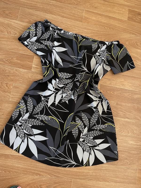 Черное мини платье со спущенными плечами в тропический принт от George, фасон свободный Тканина - креп-шифон, не тягнеться Размер - EUR 46 Пог - 58см Пот - 62см Ширина плеч - 54см(+ резинка на рукавах) Длина - 87см Стан - идеальный