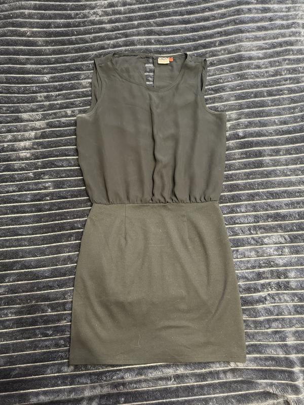 Элегантное черное платье Комбинированная, шифоновый верх+ низ трикотажный Выглядит очень красиво Размер С-М Стан замечательный Застежка сзади на спине, хорошее качество платья
