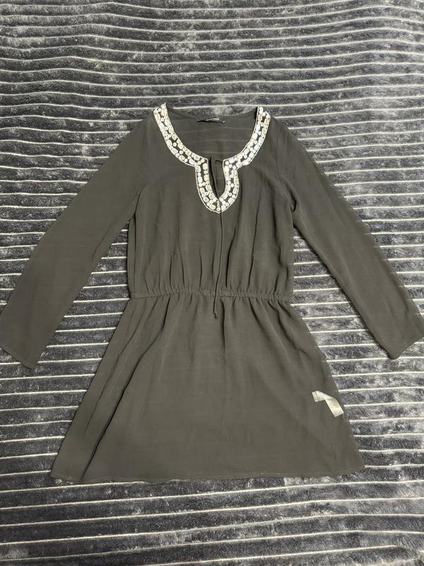 Полупрозрачное шифоновое платье обрамлено камушками, которые хорошо пришиты и хорошо держатся На талии резиночка, тянется Можно носить как платье под какой-то низ или как накидка на купальник Размер 42-46 Стан идеален, без дефектов Цвет насыщенный черный