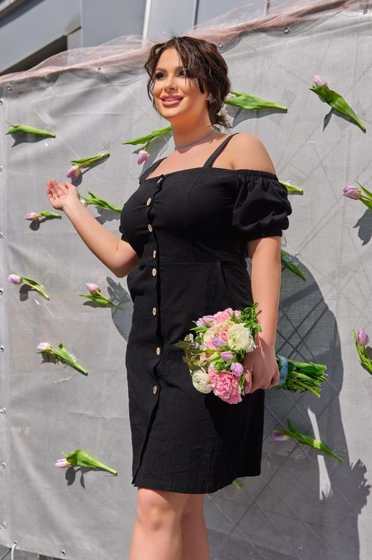 Сукня Мод: 4_0036/5/2 Стильное приталенное платье на бретелях из льна, застегивается на пуговицы по всей длине, дополнена карманами сбоку Тканина: льон жатка Размер: 48-50, 52-54, 56-58, 60-62 Цвета: черный, капучино, фисташка, голубой Длина батал (48-50/52-54/56-58/ 60-62) : * платья – 97/99/101/103 см. * рукав - 23/23/24/24 см. Фактические замеры изделия: р. 48-50 ОГ-ОТ-ОС: 96-82-106 р. 52-54 ОГ-ОТ-ОС: 106-92-114 р. 56-58 ОГ-ОТ-ОС: 114-102-122 р. 60-62 ОГ-ОТ-ОС: 122-110-130 При подборе размера в объеме груди добавляйте + 4-6 см за счет вытачек и легкой растяжимости ткани! *рост модели на фото - 173 см. *параметры модели на фото ОГ-ОТ-ОС: 110-88-111, одетая в р.52-54