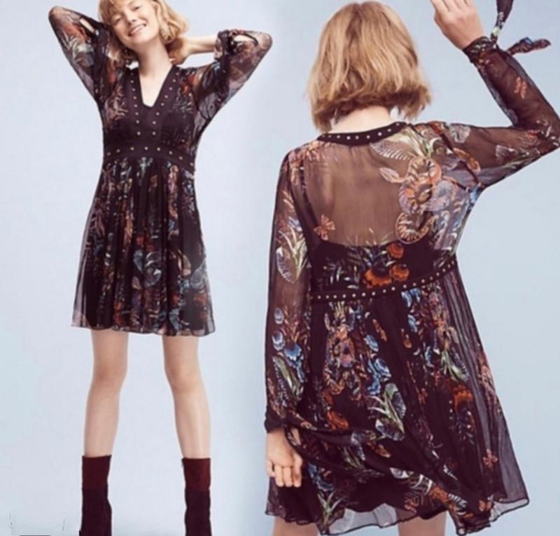 ШИКАРНОЕ прозрачное шифоновое свободное платье с цветочным принтом , черная отделка, украшенная латунными заклепками завязки на длинных рукавах . Замеры: длина 90, обхват в груди 104