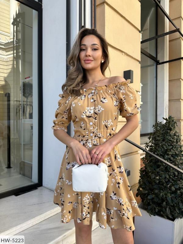 Размер: S;M;L;XL Ткань : евро-софт Цвет: бежевый Описание: трендовое и очень нежное платье с открытыми плечами и декорированными рюшами.