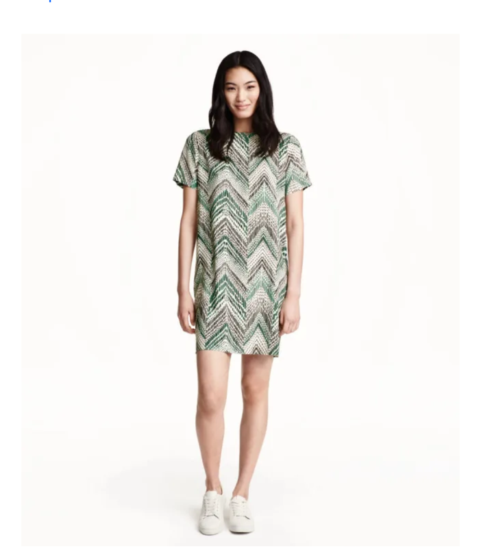 Платье с короткими рукавами H&M. Дизайн привлекает внимание, а воздушная ткань делает это платье идеальным. Сочетайте с белыми кроссовками и сумкой-шоппером, чтобы создать повседневный образ.