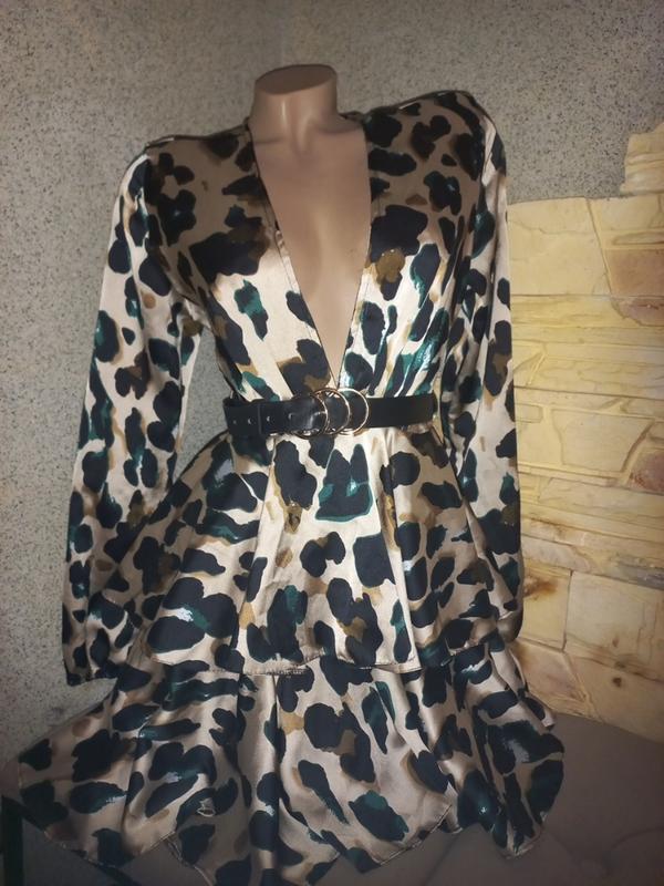 Легкое воздушное леопардовое платье. Тренд сезона. Фото на теле не имеет. Торгу не имеет. Є безпечна оплата. Пояс в комплект не входить. Имеет не большие зацепки. Высота 86, рукав 63, пог 47/52, пот 38, плечи 40.