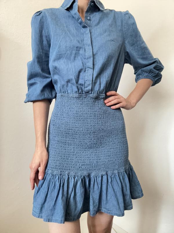 Джинсовое платье резинка платье короткое платье рубашка платье голубое платье хлопок джинс...