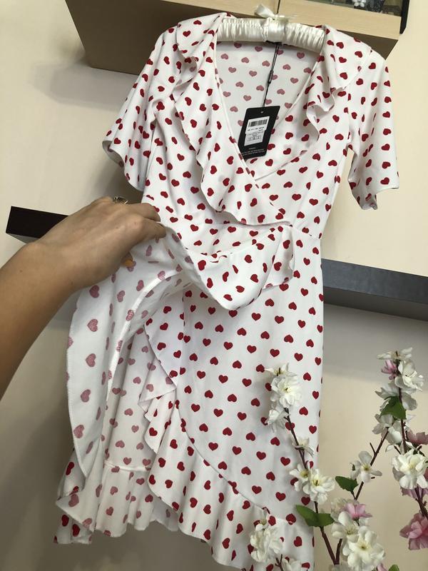 Красивое короткое платье на запах. Бренд PrettyLittleThing Размер UK 8, EUR 36 ( S ) Цвет белый с красными сердечками. Платье выглядит очень нежно и очень красиво!!! ЗАМЕРЫ —-длина от плеча сзади - 87 см —-ширина под руками в свободном положении по спинке - 40 см ( полн 80 см ) Ткань хорошо тянется, максимально до 53 см ( полн 106 см) —-ширина в талии - 33 см ( полн 66 см) Тянется! —-ширина в бёдрах - 48 см ( полн 96 см) Тянется!