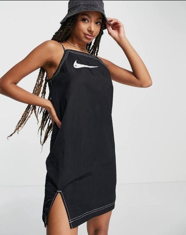 Чрезвычайно стильное летнее (и не только) платье или сарафан NIKE. На хрупкую девушку или подростка, размер S. Разрез на ножку, стильная аппликация, бретельки можно регулировать. Ткань жата, полиамид, типа плащевой, здесь уже обратите внимание. Обхват по груди 84, длина 88 по максимуму, можно уменьшить подтянув бретельки. Новая!