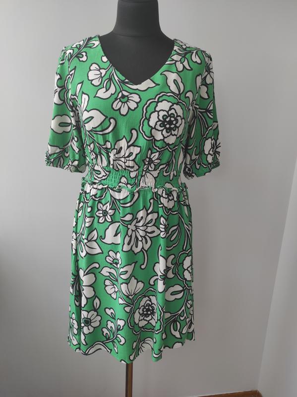 Платье в цветочный принт 16 р от f&f Размер - 16 маломерит Цвет - зеленый основной, белый цветочный принт 100 % вискоза Без подкладки Длина - 93 см Длина до резинки - 38 см Пояс - 4,5 см (резинка) Пог - 53 см Пот - 35-47 см Поб - 62 см Рукав - 9 см Плечо - 31 см