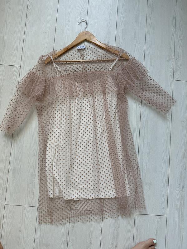 Платье состоит из двух частей Первое слой молочное платье на брителях в стиле комбинации, сверху сетка с бархатными точками, цвета пристальной розы