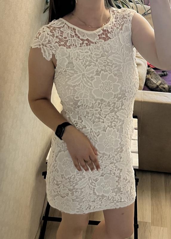 Белое кружевное платье на подкладке. Размер М. В хорошем состоянии, без дефектов. На спине молния по всей длине. При необходимости предоставят дополнительные замеры.