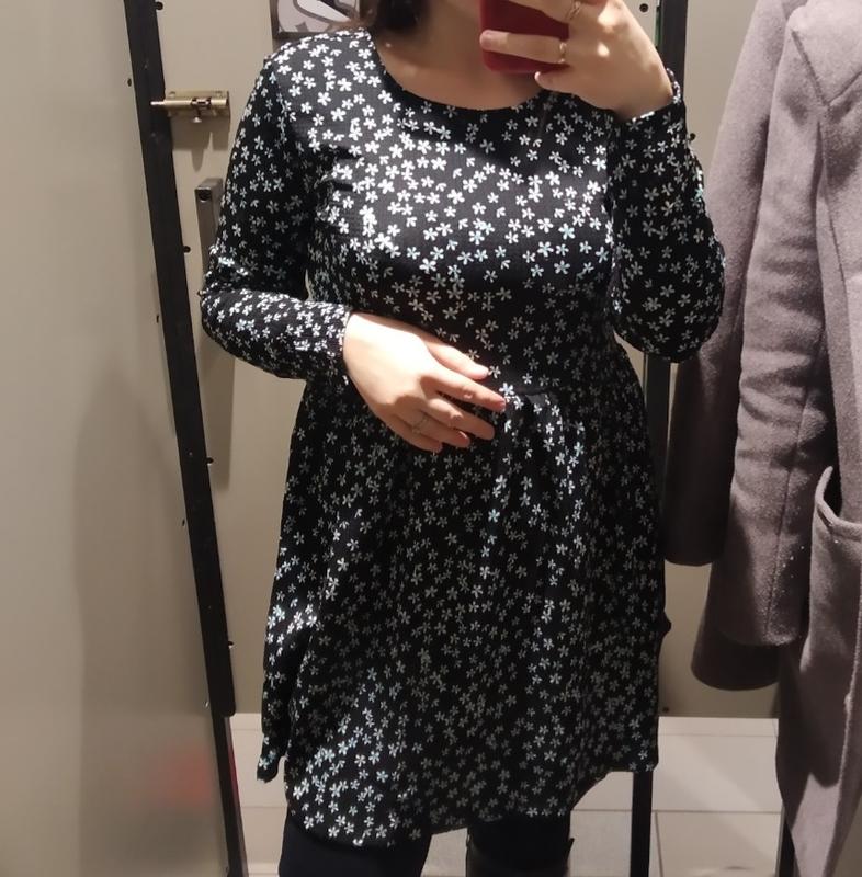 Платье осень - весна. В цветочек. Длина по колено. Ткань тянется приятная к коже. Верх в обтяжку. Выделяется талия. Подойдет для беременных также.