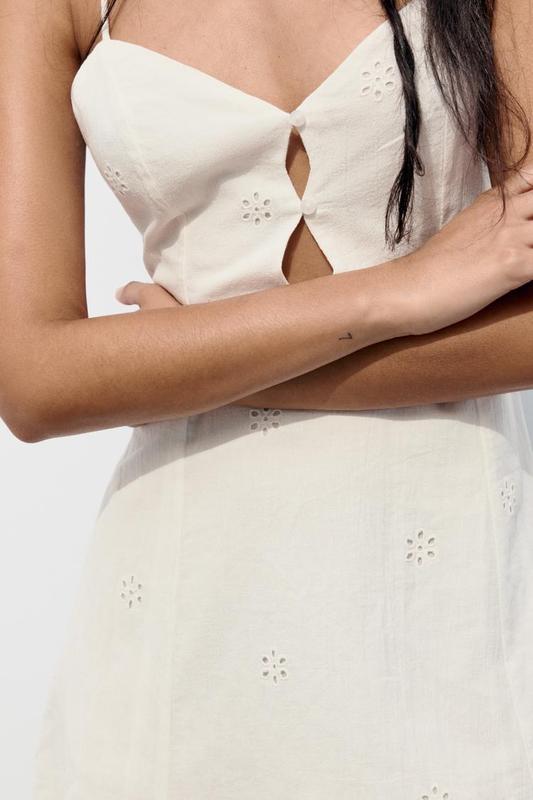 Цена 1880 Короткое платье из 14% льна. С V-образным вырезом с застежками. Тонкие бретели с регулируемыми завязками сзади. Ответная деталь вышивки. Подкладка в тон. Невидимая боковая застежка-молния. Устрично-белый <unk> 0881/372