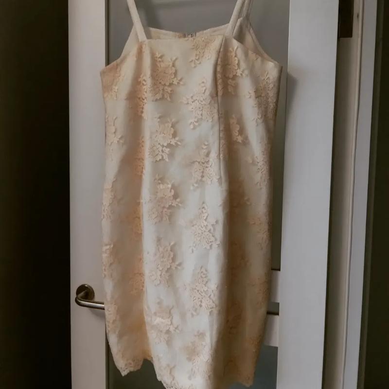 Невероятно качественный винтажный хэндмейд. Сукня-футляр. В состоянии новой вещи. Не ясно, ее вообще носили. Жаккард с золотисто-светленозеленым напылением, сверху желтоватый гипюр. Ни одно фото с настоящим цветом не получилось, третье фото больше всего похоже. Внизу еще подкладка. Замеры: на грудь где-то 102см, бедра 110см, длина по боковому шву 78см.