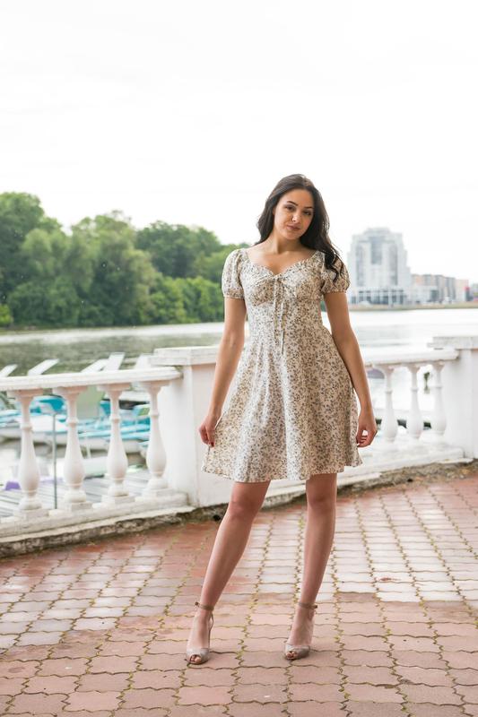 Сукня з віскози з незабудками. Рукав ліхтарик. Застібка на потайний замочок.