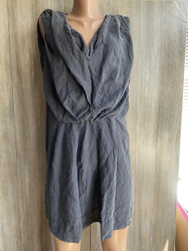 Платье угольно-серого цвета, 100% шелк, платье размера 12. Длина выше колен. Лиф обшит такой же ткани