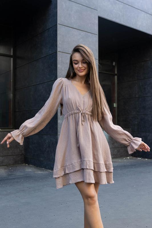 Летнее мини платье из муслина мокко. Модель стилизована объемными рукавами с аккуратным воланом на резинке, пышной юбкой с рюшей и глубоким фигурным вырезом по горловине. По талии – кулиска со шнуром. Товар под заказ. Срок отшива 5-7 рабочих дней. Материал/cклад: муслин (100% хлопок); Растяжимость: нет; Длина изделия: 87 см; Длина рукава: 64 см; Параметры модели, см: 86х64х93, рост 163 см; На модели представлен размер: XS (40/42). ❗ Все заказы оформляются только через ЧАТ, через кнопку КУПИТЬ ➡️ отклонены. Страна производитель ➡️ Украина. 🚛 Доставка ➡️ "Новой почтой" (2-3 рабочих дня). Доставка сплачивает покупатель. 👛 Оплата ➡️ 100% Передача на р/р ФОП "ПриватБанка" или после платья с авансом. Если посылку не забираете, аванс возвращаем по учету транспортных расходов в обе стороны. 📦 🔁 Обмен и возврат ➡️ за счет покупателя, при наличии оригинального и невредимого упаковки и ярлыков, отсутствия следов эксплуатации, стирки и ношения.
