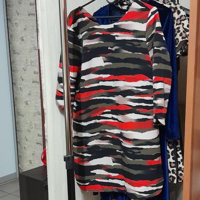 Продам платье, идеальное состояние, прямой крой, подойдет на 46 размер. Рукав 3/4, по бокам маленькие разрезы. Качество отличное! Длина 85 Пог 48 Поб 53 Плечи 38 Рукав 48 Состояние новой Тканина цупка, не тягнеться Подойте и под каблук, и под кеды