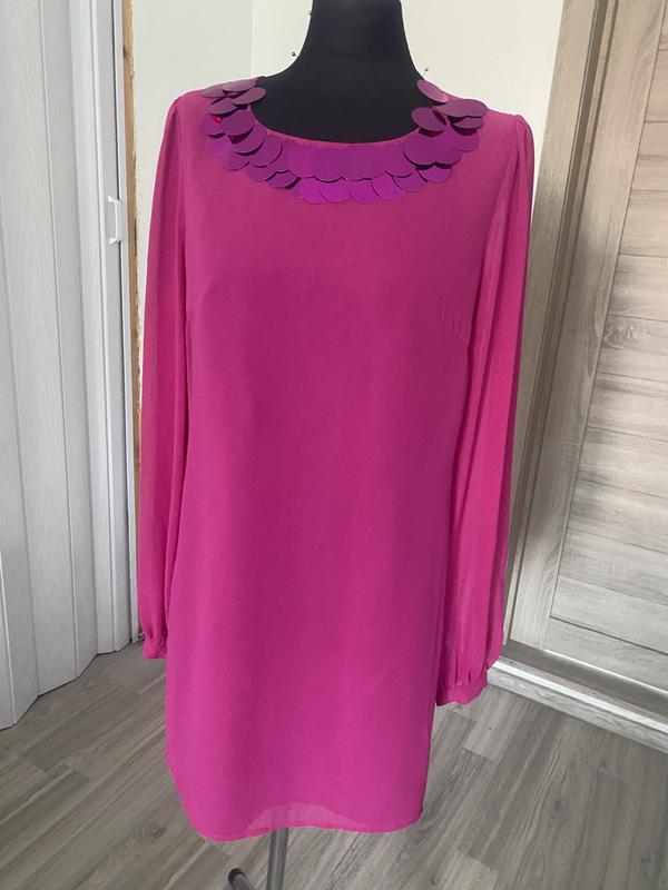 Красивое, нарядное платье-туника из шифона свободного кроя, горловина украшена блестками, рукав длинный, на спинке молния.