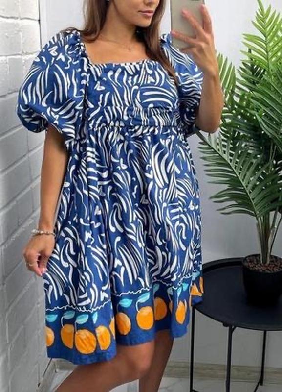 Яркое натуральное платье на лето. Пышный рукав-фонарик. Сзади интересное решение с завязанным бантом. Насыщенное сочетание цветов: синего и желтого.