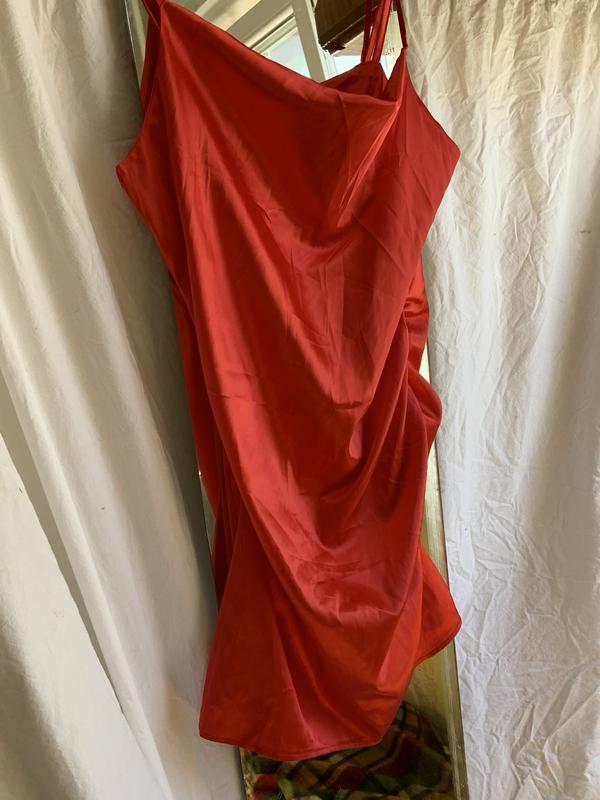Платье, атлас с одной стороны идет по собранно, есть двойная подкладка на груди не просвечивает