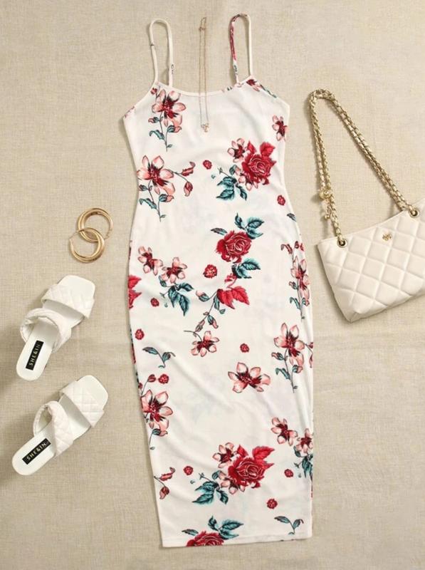 Женское платье с цветочным принтом. Разделенная спина. Облегающее платье размер Л бюст 86 талия 75 стегна 92 длина 118 длина бретели 30